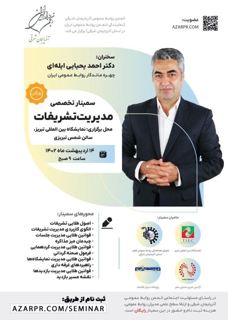 رئیس شورای سیاست گذاری انجمن روابط عمومی آذربایجان شرقی از برگزاری نخستین سمینار تخصصی “مدیریت تشریفات” در تبریز خبر داد.