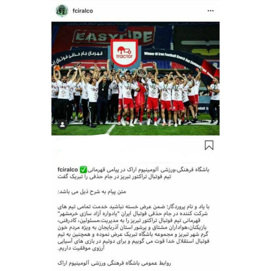 باشگاه آلومینیوم اراک با انتشار پیامی قهرمانی تراکتور در جام حذفی را به اعضای این تیم تبریک گفت.