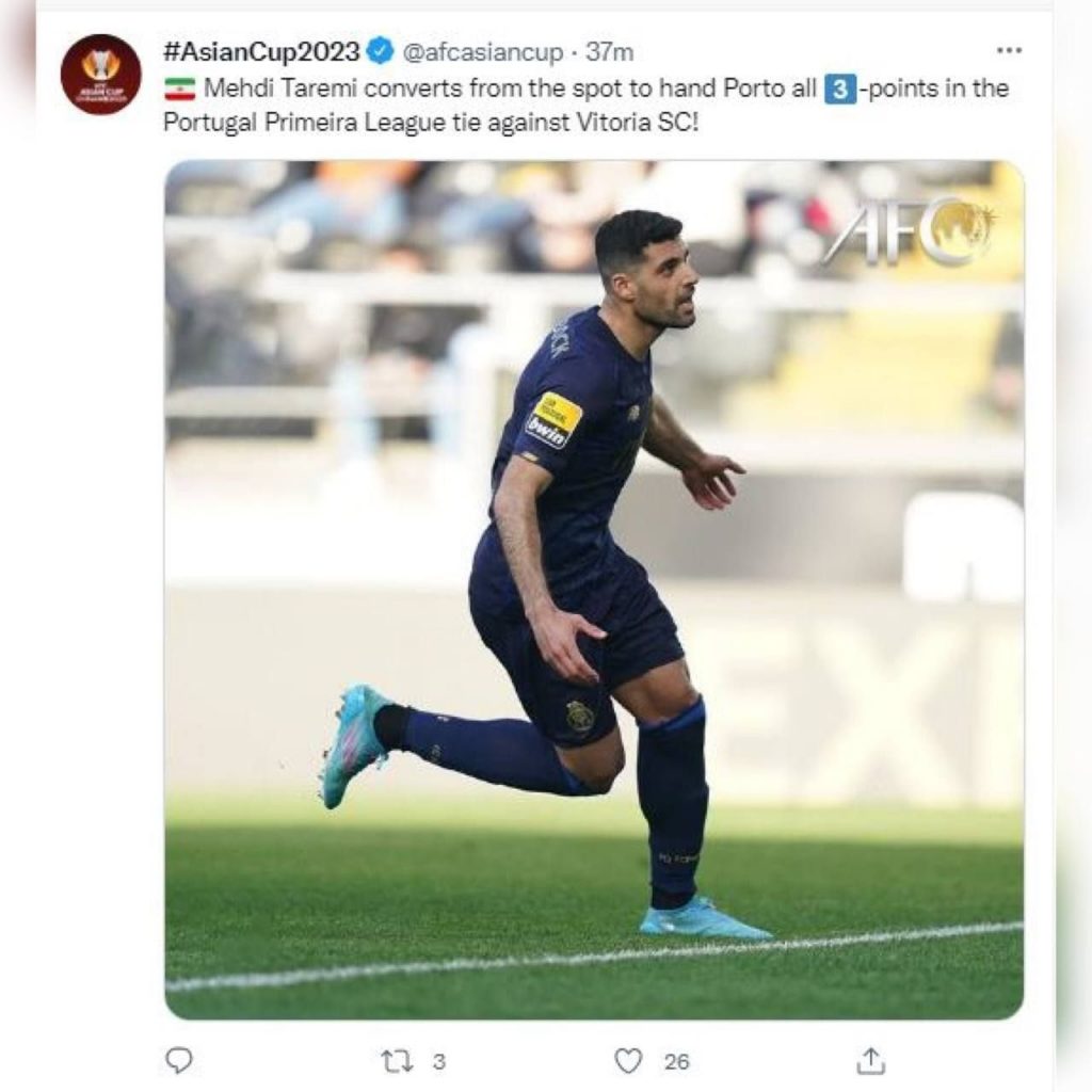 🔹توئیتر رسمی AFC لحظاتی پیش با انتشار تصویر مهدی طارمی به تمجید از این بازیکن ایرانی پرداخت و نوشت: مهدی طارمی در بازی لیگ برتر پرتغال مقابل ویتوریا گیمارش با ضربه پنالتی ۳ امتیاز را برای تیمش به ارمغان آورد.