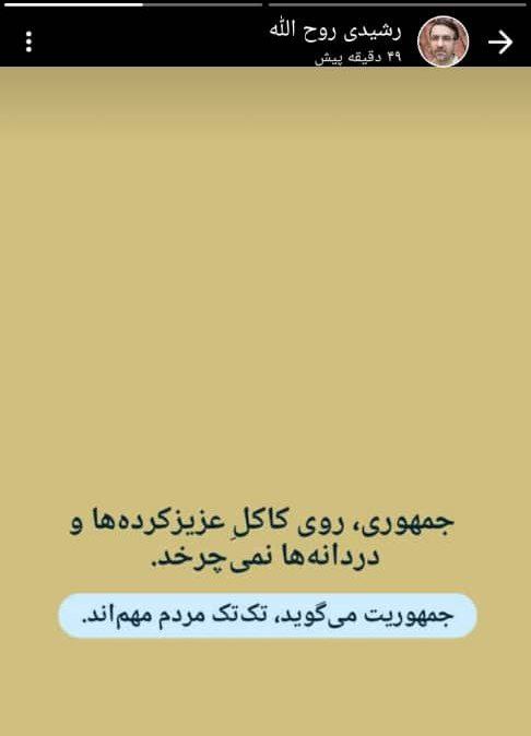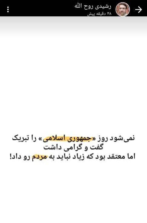 ▫️روح الله رشیدی عضو شورای شهر به مناسبت ۱۲ فروردین سالروز استقرار جمهوری اسلامی ایران دیدگاه خود را بیان کرد. ▫️وی در تعریف جمهوری اسلامی از دیدگاه خود نوشته است : نمی شود روز جمهوری اسلامی را تبریک گفت و گرامی داشت اما معتقد بود که زیاد نباید به مردم رو داد .جمهوری اسلامی روی کاکل عزیز کرده ها و دردانه ها نمی چرخد. جمهوریت می گوید تک تک مردم مهم اند.