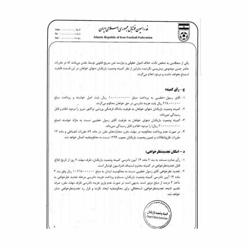 باشگاه آلومینیوم اراک رسول خطیبی را در کمیته تعیین وضعیت فدراسیون فوتبال محکوم کرد.باشگاه آلومینیوم اراک که پس از جدایی رسول خطیبی و حضور او در تراکتور، شکایتی را علیه این سرمربی تقدیم کمیته تعیین وضعیت کرده بود، حالا با حکم این کمیته مواجه شده است.بر اساس این حکم رسول خطیبی یک میلیارد تومان جریمه شده و همچنین رقم ۲۸ میلیون تومان نیز مازاد بر این رقم باید به آلومینیوم پرداخت شود.