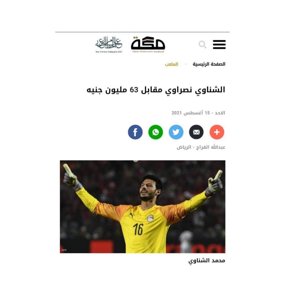 🔸از چندی پیش اخبار فراوانی پیرامون علاقه النصر به محمد الشناوی گلر تیم الاهلی مصر در رسانهها منتشر شد ولی دو باشگاه با تکذیب این خبر، مدعی شدند مذاکرهای برای حضور سنگربان تیم ملی مصر در فوتبال عربستان انجام نشده است.🔸اما روزنامه مکه در شماره امروز خود مدعی شد که کار این انتقال تمام شده است. این روزنامه به نقل از یک منبع آگاه در باشگاه الاهلی مصر نوشت کار انتقال محمد الشناوی دروازهبان ملیپوش الاهلی به النصر، پس از پایان لیگ مصر انجام خواهد شد. شرط این انتقال، پرداخت هزینه ۶۳ میلیون پوند مصری (واحد پول این کشور) از سوی النصر است.🔸اگرچه حامد الحدیدی مدیربرنامه این بازیکن در گفتگو با رسانههای مختلف مذاکرات النصر با موکلش را تکذیب کرد، اما این منبع تأیید کرد که تقریباً مسائل مربوط به باشگاه النصر از طریق یکی از میانجیگران که قبلاً انتقالات چشمگیری را در فوتبال عربستان به ثبت رسانده، قابل حل است.