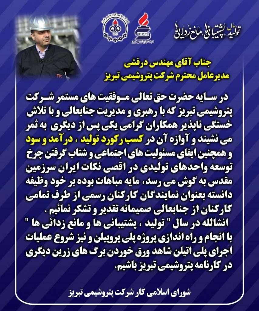 🔷شوراي اسلامي كار كاركنان پتروشيمي تبريز طي لوحي از مديرعامل شركت پتروشيمي تبريز تقدير و تشكر نمودند: جناب آقای مهندس درفشی مدیرعامل محترم شرکت پتروشیمی تبریز🔹در سایه حضرت حق تعالی موفقیت های مستمر شرکت پتروشیمی تبریز که با رهبری و مدیریت جنابعالی و با تلاش خستگی ناپذیر همکاران گرامی یکی پس از دیگری به ثمر می نشیند و آوازه آن در کسب رکورد تولید ، درآمد و سود و همچنین ایفای مسئولیت های اجتماعی و شتاب گرفتن چرخ توسعه واحدهای تولیدی در اقصی نکات ایران سرزمین مقدس به گوش می رسد، مایه مباهات بوده بر خود وظیفه دانسته بعنوان نمايندگان کارکنان رسمی از طرف تمامي كاركنان از جنابعالی صمیمانه تقدیر و تشکر نمائیم .🔹انشالله در سال ” تولید ، پشتیبانی ها و مانع زدائی ها “با انجام و راه اندازی پروژه پلی پروپیلن و نیز شروع عملیات اجرای پلی اتیلن شاهد ورق خوردن برگ های زرین دیگری در کارنامه پتروشیمی تبریز باشیم.