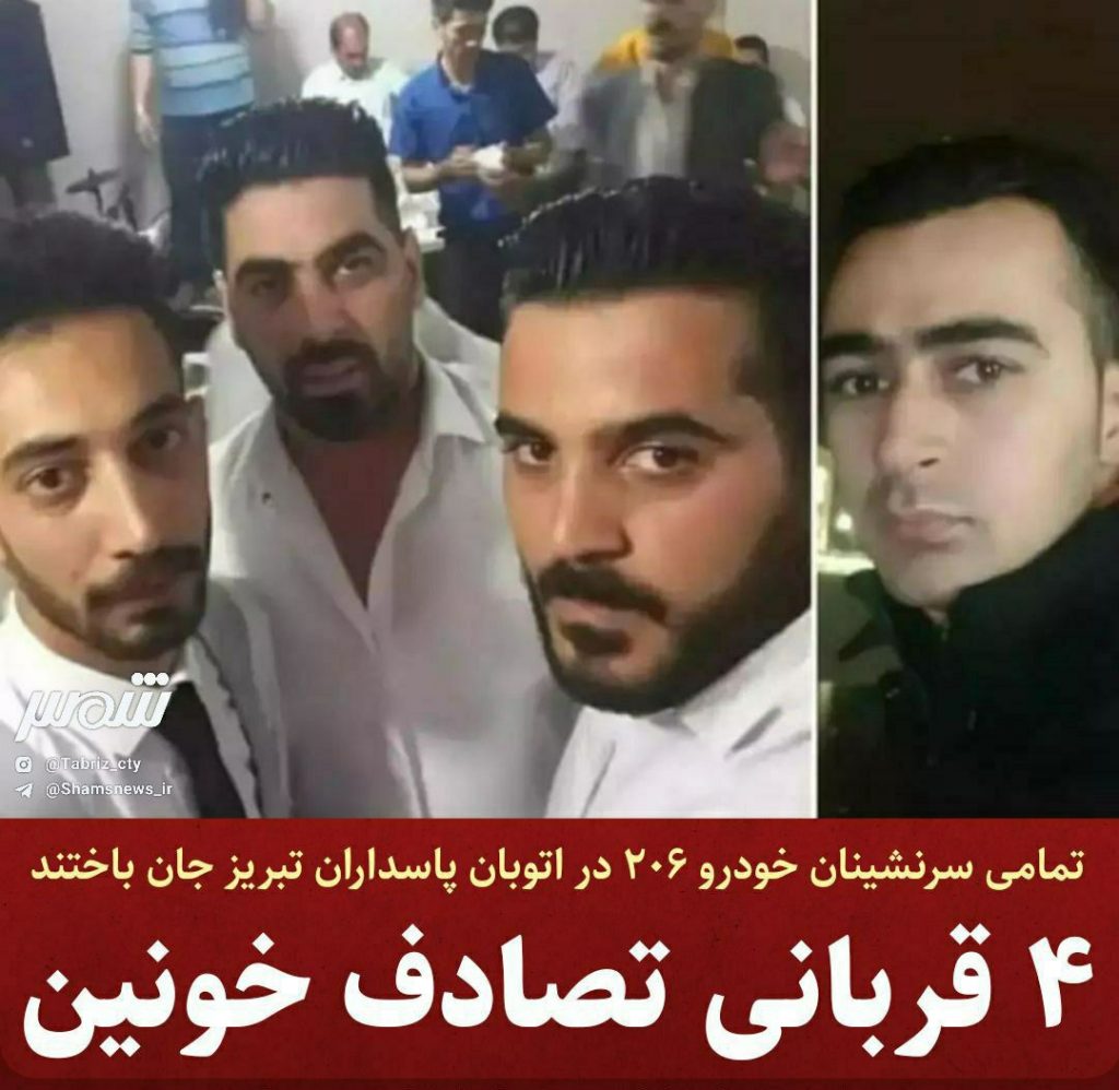 بامداد امروز یک دستگاه خودرو پژو ۲۰۶ با سرعت بالا با اسکانیا برخورد کرد و حادثهای خونین در اتوبان پاسداران تبریز رقم زد.▫️در سمت چپ تصاویر حامد، بهزاد و رامین را میبینید که در دم جان باختند.▫️محمد، تنها مصدوم این حادثه نیز دقایقی قبل در بیمارستان جان باخت تا شمار قربانیان این واقعه به ۴ جوان افزایش یابد.