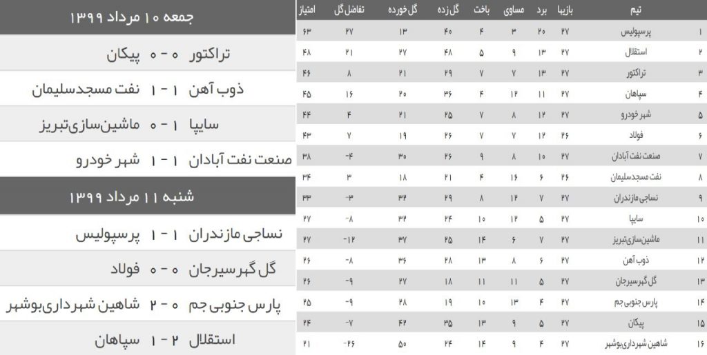 ⚽️نتایج و جدول لیگ برتر پس از پایان هفته بیست و هفتم